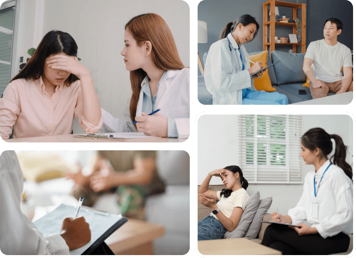 Khách hàng được tư vấn ban đầu, sau đó bác sĩ thăm khám để đánh giá triệu chứng, mức độ ảnh hưởng, tiền sử sức khỏe và các yếu tố tâm lý, sinh hoạt, xã hội liên quan.